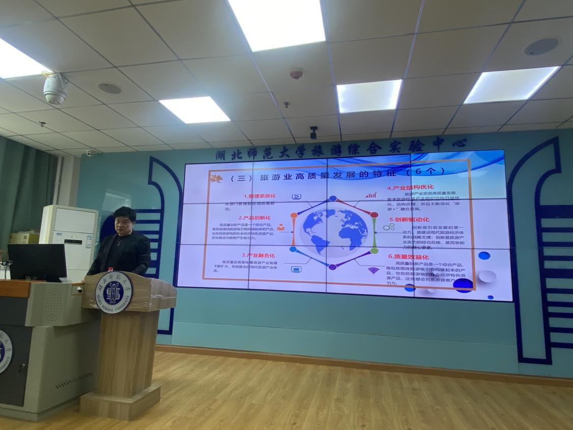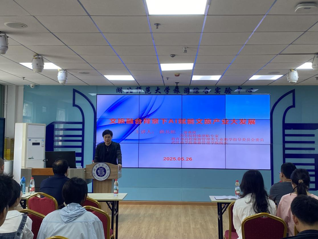 5月26日上午,武汉商学院旅游管理学院院长薛兵旺教授应邀走进六合宝典下载 旅游综合实训室,开展题为“文旅融合背景下AI赋能文旅产业大发展”的专题讲座。本次活动由六合宝典下载 院长蔡明伦教授主持,旅游专业全体师生齐聚一堂,共赴这场知识盛宴。