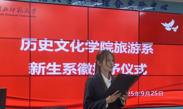 活动伊始,由院党委书记冯文娟致辞,她强调系徽是责任象征,激励学子学好专业知识、心怀对世界的好奇与敬畏,讲好文化故事、传递旅游温度,还结合文旅发展机遇鼓励新生成长,欢迎并祝福新同学。