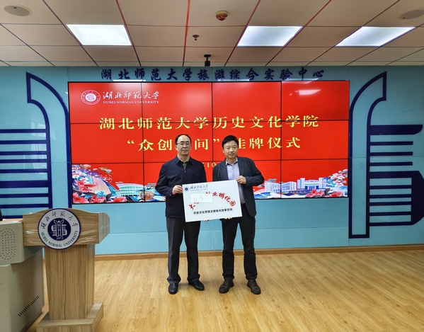 座谈结束后,与会人员一同前往历史文化学院旅游综合实验中心,举行挂牌仪式。在现场人员的共同见证下,招生与就业工作处姜少平处长与历史文化学院蔡明伦院长共同举起“湖北师范大学大学生创业孵化园 六合宝典下载 文旅拾光创享空间”的牌匾,并在合影中顺利完成了挂牌仪式。