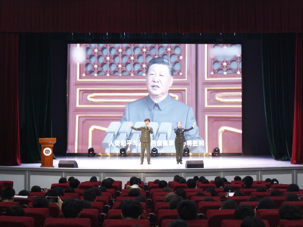 活动伴随着退役学生代表演唱的军旅歌曲《绿旋风》正式开始,在“爱国三问”环节中,现场师生在肯定的回答中坚定身份认同与责任当担;随后师生齐唱《中国军魂》,在歌声中彰显青春锐气;播放的抗战短片《我们在纪念什么》以短片的形式,回溯烽火岁月,让在场者深切体会和平来之不易。