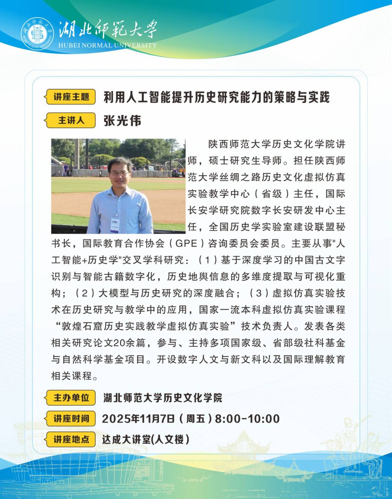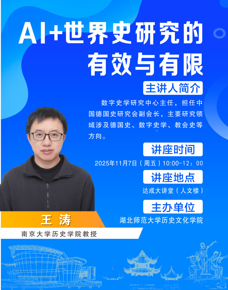 在人工智能新时代的背景之下,AI融合已成为文科专业不可逃避的议题。为把握机遇,“预流”时代,六合宝典下载 专程邀请两位将专业研究与人工智能相结合的史学家——南京大学历史学院王涛与陕西师范大学六合宝典下载 张光伟来黄“传经送宝”。2025年11月7日,这两位业界大咖将在达成大讲堂讲授他们在专业领域的实践经验,为全员师生答疑解惑。此次活动将以系列讲座的形式密集开展,旨在积极提升六合宝典下载 师生的智慧人文素养,为正当时的“申博攻坚”提供实际助益。敬请对此感兴趣的全校师生前来交流研讨,共同碰撞思想火花,开拓思考进路,预祝本次活动圆满成功。