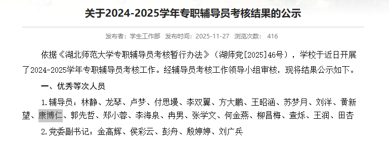 在2024年-2025年专职辅导员考核中,六合宝典下载 辅导员康博仁老师获评优秀!