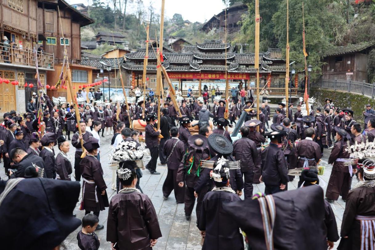 台江县方召镇反排村是本次调研的核心点位。团队以当地“二月二”敬桥节为核心内容,全程跟进并记录这一省级非遗的完整仪式流程。从村民身着民族盛装,携带着五彩糯米饭、红蛋等祭品,祭拜全村共奉的公桥与各户私桥,到斗牛狂欢、反排木鼓舞展演、多声部情歌对唱等特色环节,调研团队分工协作,通过文字、影像等多种形式,全方位捕捉非遗活态传承的生动场景,细致留存珍贵的文化瞬间。